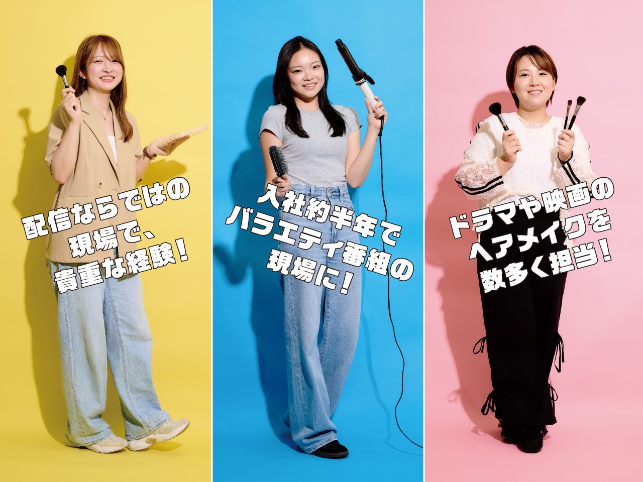 今回は、そこで学び実際にヘアメイクとして活躍している3人に、仕事に就くまでの道のりややりがいを語ってもらいました。