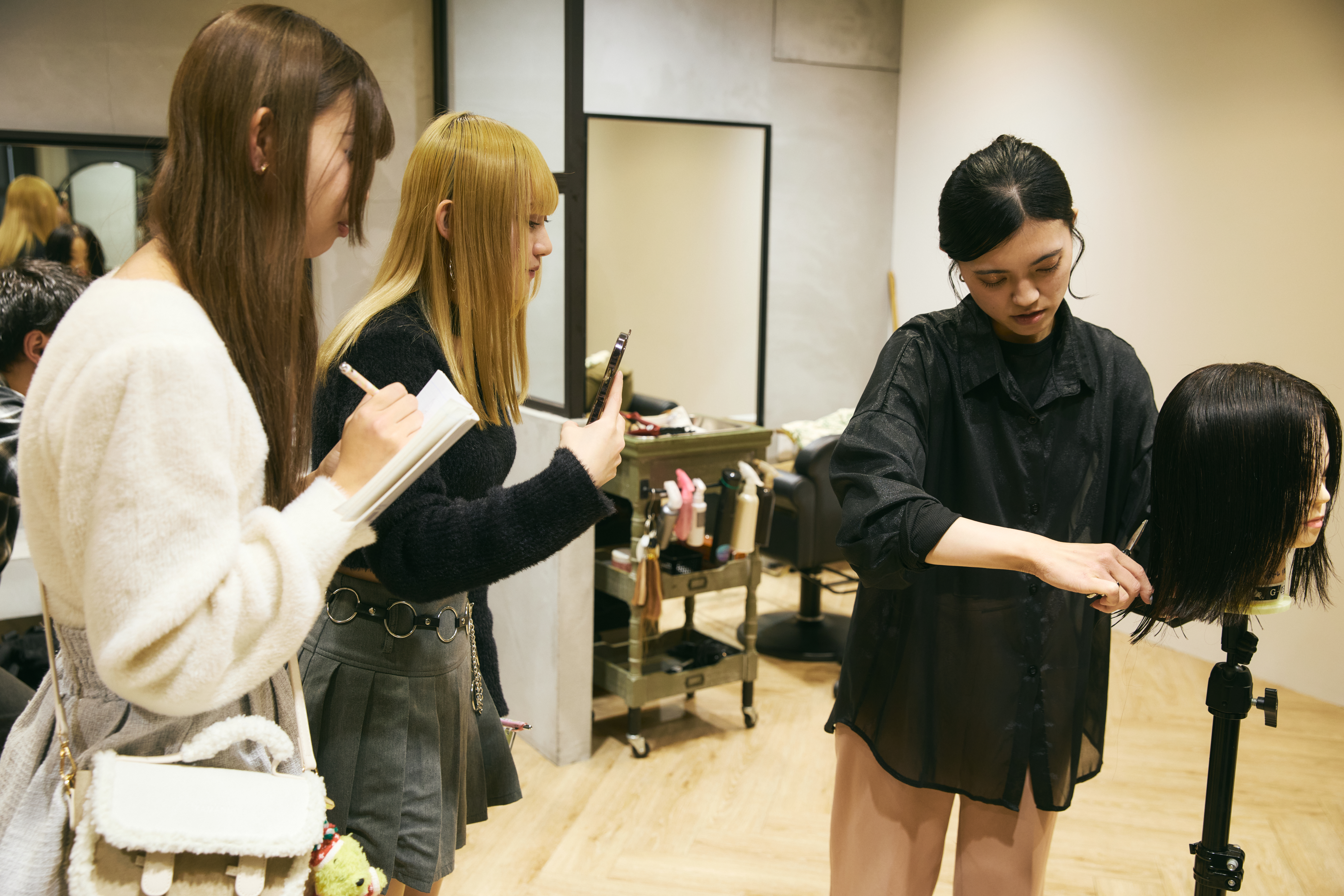 小柳さん レッスンする講師が決めます。そのときどきのトレンド感があるテーマが多くて、今日は、顔周りレイヤーの外ハネスタイルの作り方でした。写真や展開図などの資料を見ながら、全員で同じスタイルを切るのですが、わからないところがあったらすぐ先輩に質問できるので、リラックスした雰囲気でレッスンできますよ。